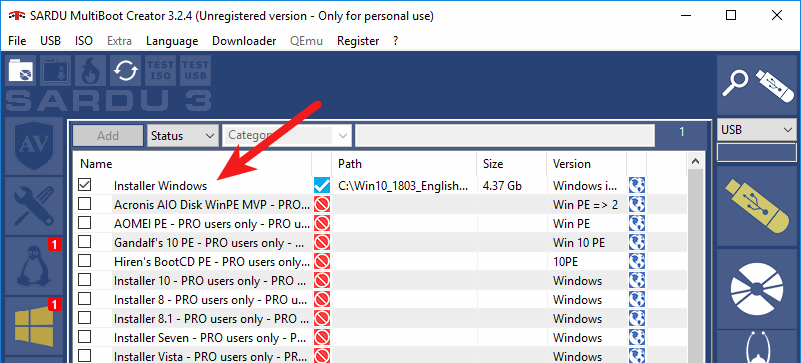 To add Windows 7, Windows 8, or Windows 10 ISO images to your USB flash drive, you need to use the SARDU Windows version. Click the Windows icon on the left bar, and select the first item in the list. Choose the ISO path, then tick on the name.