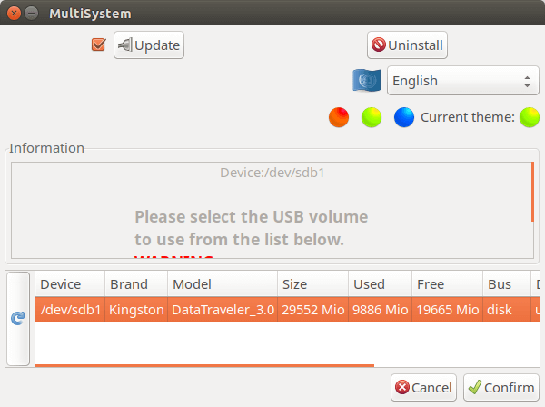 Once installed, open it from your application menu. Then insert your USB flash drive and click the refresh button in MultiSystem for it to detect your drive. (Make sure the USB flash drive is mounted). Once it finds your USB flash drive, select the device and click confirm button.