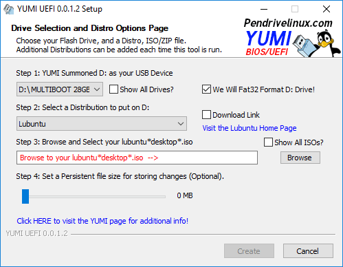 Then select the name of the OS you want to put into the USB. Next, select the ISO image file from your hard drive. In step 4, you can choose the persistent file size.