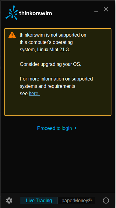 I just received a message “thinkorswim is not supported on this computer’s operating system, Linux Mint 21.3. Consider upgrading your OS.