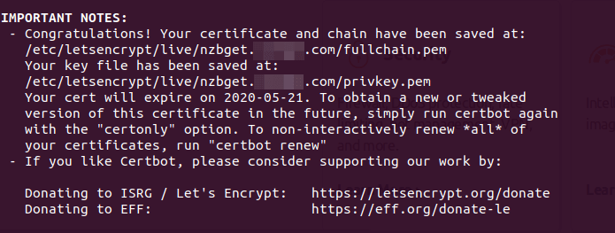 sudo certbot --nginx --agree-tos --redirect --hsts --staple-ocsp --email [email protected] -d nzbget.your-domain.com