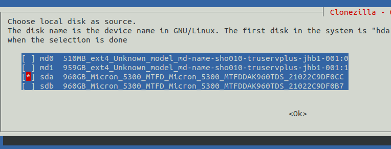 If you have a software RAID setup, then Clonezilla will give you several options, including the RAID device (md0, md1). You just need to choose one of the real disks, such as sda.