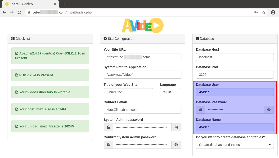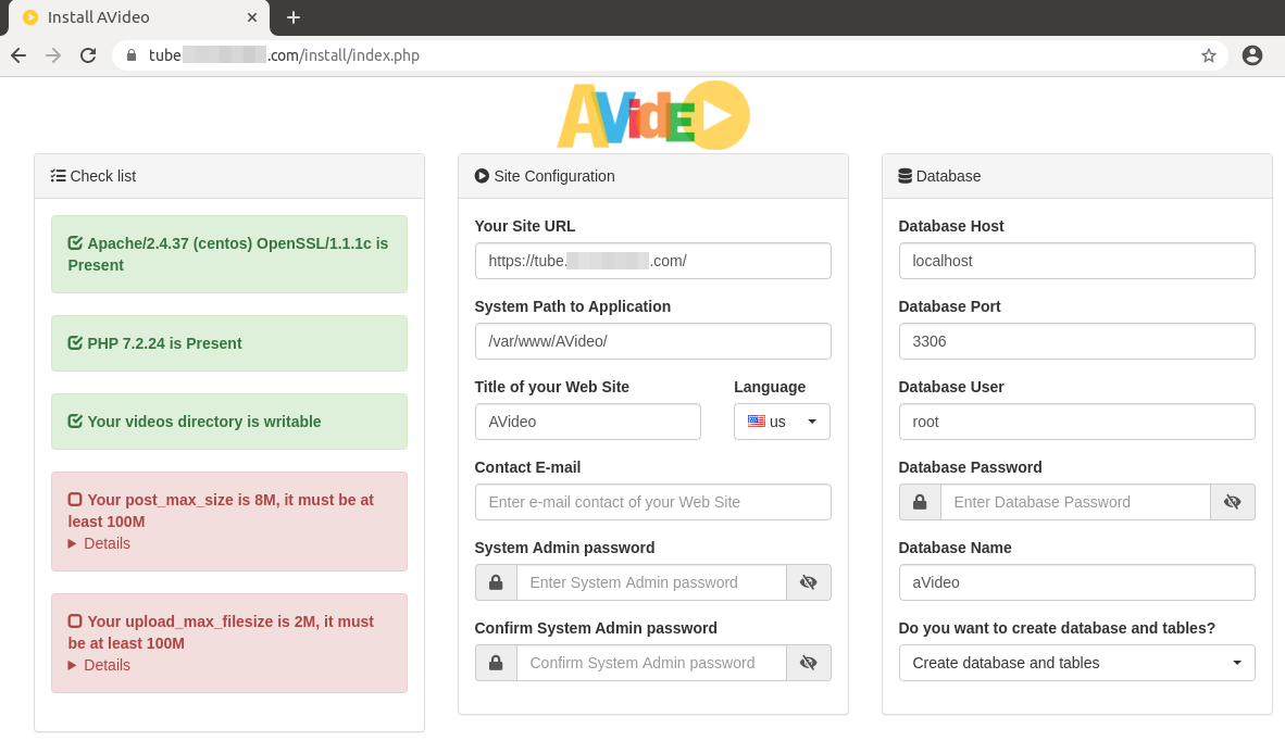 Now refresh the AVideo install wizard page. Your server should pass all requirements. Now on the right side, you can enter a title your video site, and set a system admin password. Enter the AVideo database name, user and password you created earlier. (Note: You should use the main database, not the encoder database. Also be aware of case-sensitive.)