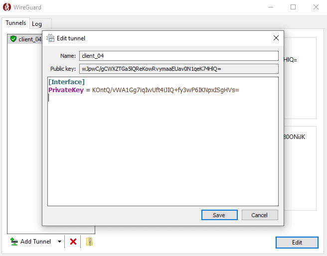 DNS = 10.10.10.1,8.8.8.8. Note that the Windows app doesn’t support theDNS = 10.10.10.1 8.8.8.8syntax. - PrivateKey: The Windows client’s private key, which is automatically created.
