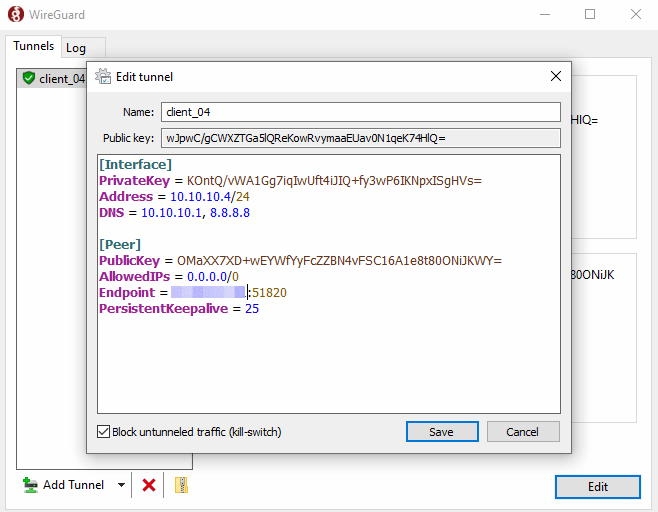 [Interface] Address = 10.10.10.2/24 DNS = 10.10.10.1 PrivateKey = cOFA+x5UvHF+a3xJ6enLatG+DoE3I5PhMgKrMKkUyXI= [Peer] PublicKey = vxyo4l4I3jWK+KZquNIDJF/hzQq29DOIxSUOrfNZZCs= AllowedIPs = 0.0.0.0/0 Endpoint = 12.34.56.78:51820 PersistentKeepalive = 25