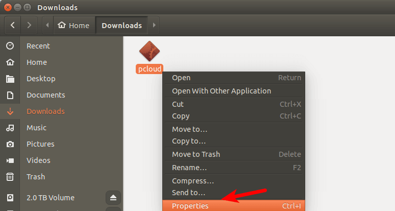Once it’s downloaded, open your file manager and go to the download destination folder. Then right-click the pcloud binary and select properties in the context menu.