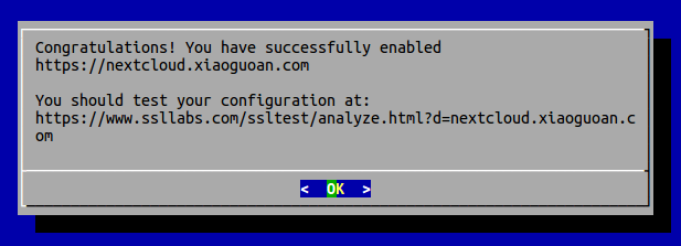 Once you hit the OK button, a free TLS/SSL certificate is obtained and installed on your Apache server.