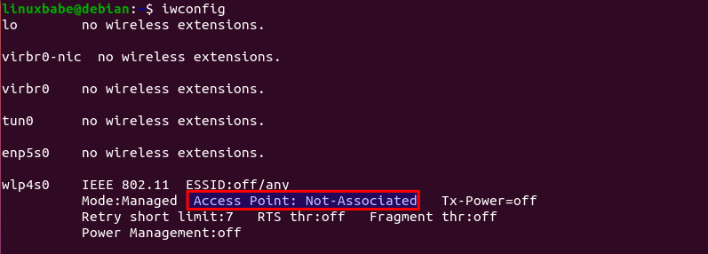 As you can see, the wireless interface isn’t associated with any access point right now. Then run the following command to bring up the wireless interface.