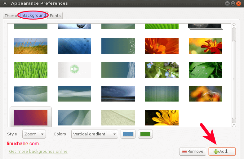 Then go to System > Preferences > Appearance. In background tab, click Add button.