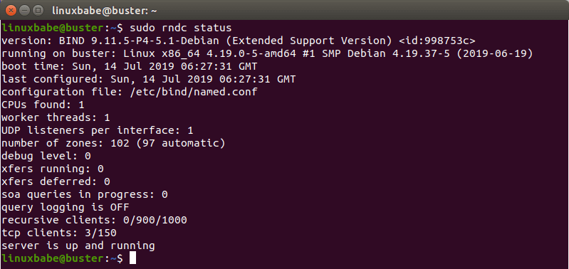 The BIND daemon is called named. (A daemon is a piece of software that runs in the background.) The named binary is installed by the bind9 package and there’s another important binary: rndc, the remote name daemon controller, which is installed by the bind9utils package. The rndc binary is used to reload/stop and control other aspects of the BIND daemon. Communication is done over TCP port 953.