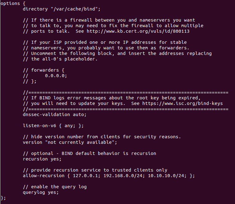Out of the box, the BIND9 server on Debian provides recursive service for localhost and local network clients only. Outside queries will be denied. So you don’t have to edit the configuration files. To get you familiar with BIND 9 configurations, I will show you how to enable recursion service anyway.