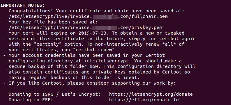 sudo certbot --nginx --agree-tos --redirect --hsts --staple-ocsp --email [email protected] -d invoice.yourdomain.com