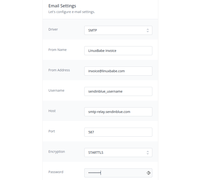 Next, Enter SMTP settings to make sure it can end invoices to your clients via email. If you use the free Sendinblue SMTP relay service, then enter your Sendinblue credentials here.