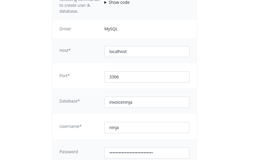 DB_HOST=localhost DB_DATABASE=invoiceninja DB_USERNAME=ninja DB_PASSWORD=ninja_password DB_PORT=3306