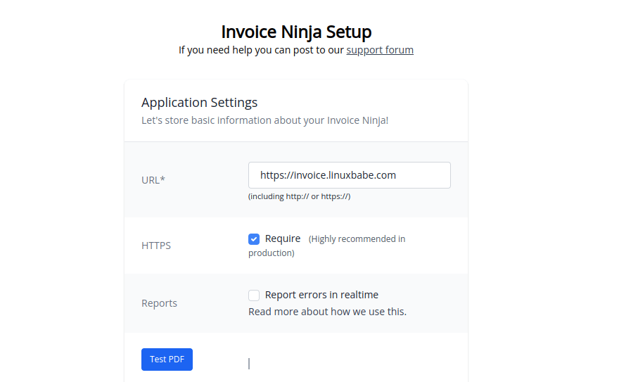 Now go to invoice.yourdomain.com/setup to launch the web-based setup wizard. First, you need to designate an URL for your InvoiceNinja installation (https://invoice.yourdomain.com).