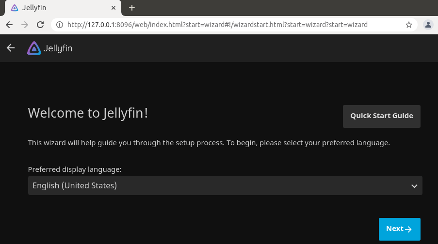 The web-based management interface is available at port 8096. You can access Jellyfin web interface via the following URL.