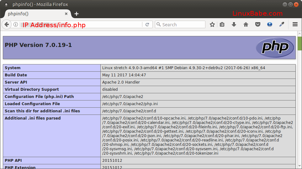 Save and close the file. Now in the browser address bar, enter server-ip-address/info.php. Replace sever-ip-address with your actual IP. If you follow this tutorial on your local computer, then type 127.0.0.1/info.php or localhost/info.php.