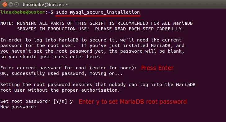 When it asks you to enter MariaDB root password, press Enter key as the root password isn’t set yet. Then enter y to set the root password for MariaDB server.