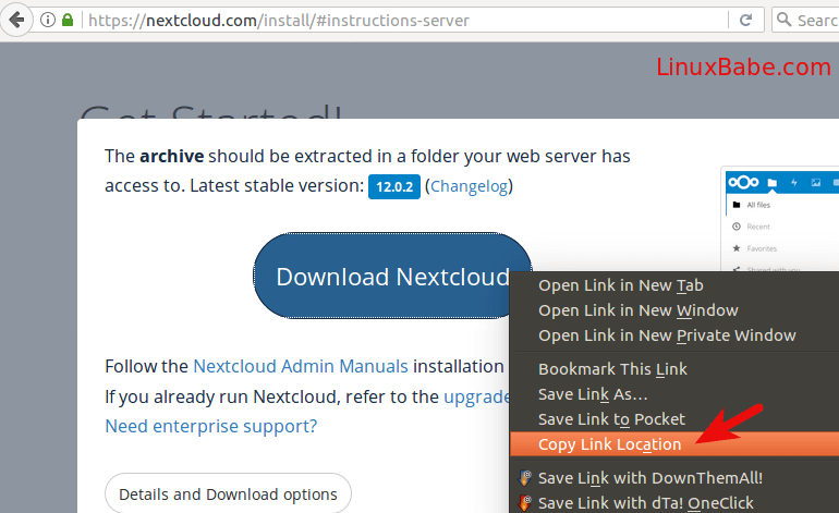 There may be a newer version when you follow this tutorial. Go to https://nextcloud.com/install and click the download button to check out the latest version. To get the download link of NextCloud, simply right-click on Download NextCloud button and select Copy Link Location as shown in the screenshot below.