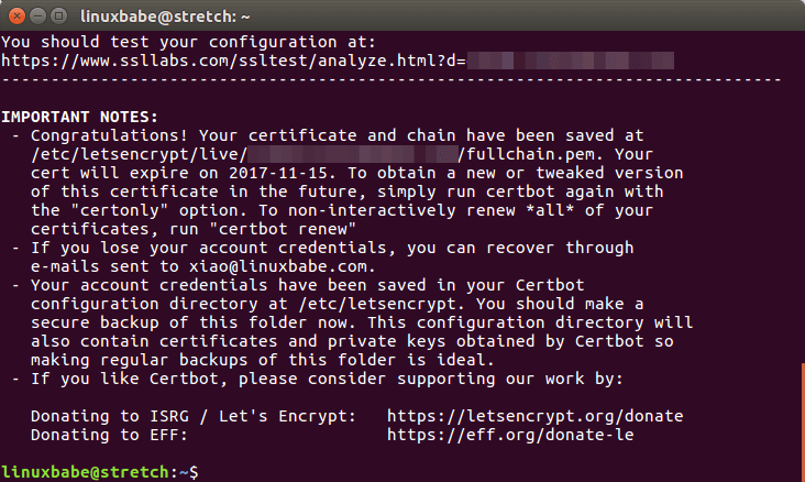 Within a few seconds, you shall see a message like below, which means the TLS certificate was successfully obtained and installed. The TLS configuration scores A in SSL test.