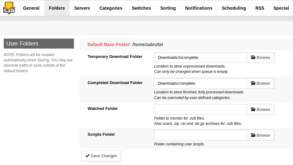 The default download folder is /home/sabnzbd/Downloads. If you want to change it to another directory, for example, your external hard drive, click the Folder menu in the SABnzbd web interface. Then click the Browser button to change it.
