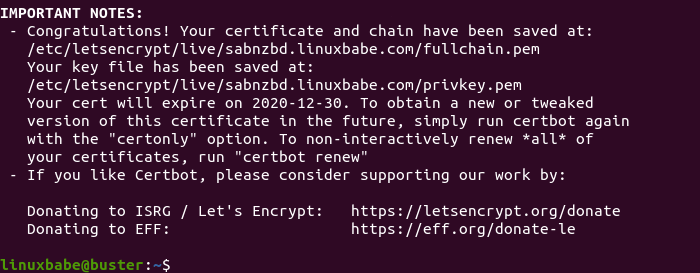 sudo certbot --nginx --agree-tos --redirect --hsts --staple-ocsp --email [email protected] -d sabnzbd.your-domain.com