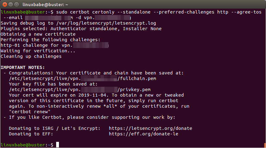 sudo certbot certonly --standalone --preferred-challenges http --agree-tos --email [email protected] -d vpn.example.com