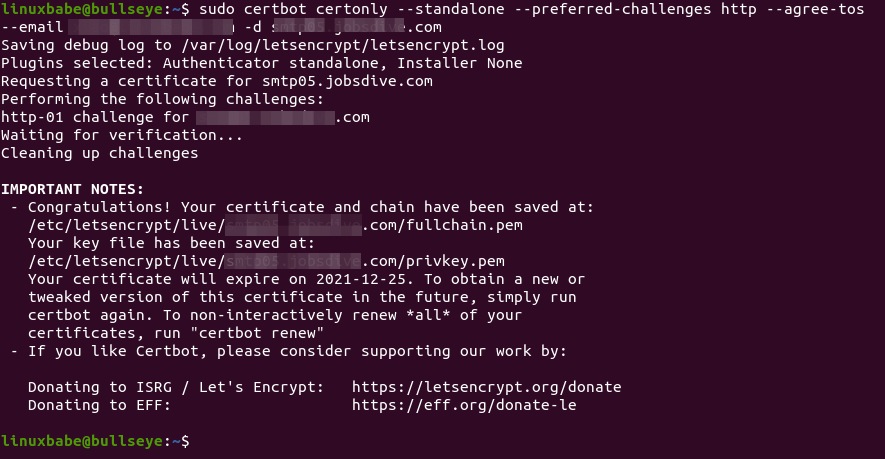 If your Debian 11 Bullseye server has a web server listening on port 80 and 443, then it’s a good idea to use the webroot plugin to obtain a certificate because the webroot plugin works with pretty much every web server and we don’t need to install the certificate in the web server.