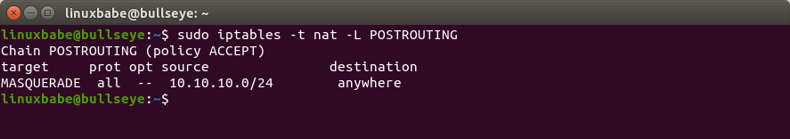 For me, the `iptables -t nat -L POSTROUTING` command does not show anything. Even after multiple restart of the ufw and waiting.