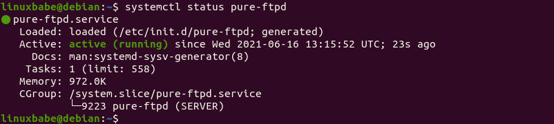 ● pure-ftpd.service Loaded: loaded (/etc/init.d/pure-ftpd; generated) Active: active (running) since Wed 2021-06-16 13:15:52 UTC; 23s ago Docs: man:systemd-sysv-generator(8) Tasks: 1 (limit: 558) Memory: 972.0K CGroup: /system.slice/pure-ftpd.service └─9223 pure-ftpd (SERVER)