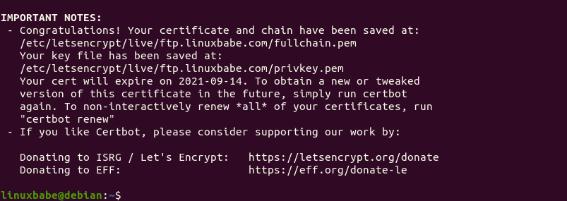 sudo certbot certonly --standalone --preferred-challenges http --agree-tos --email [email protected] -d ftp.example.com