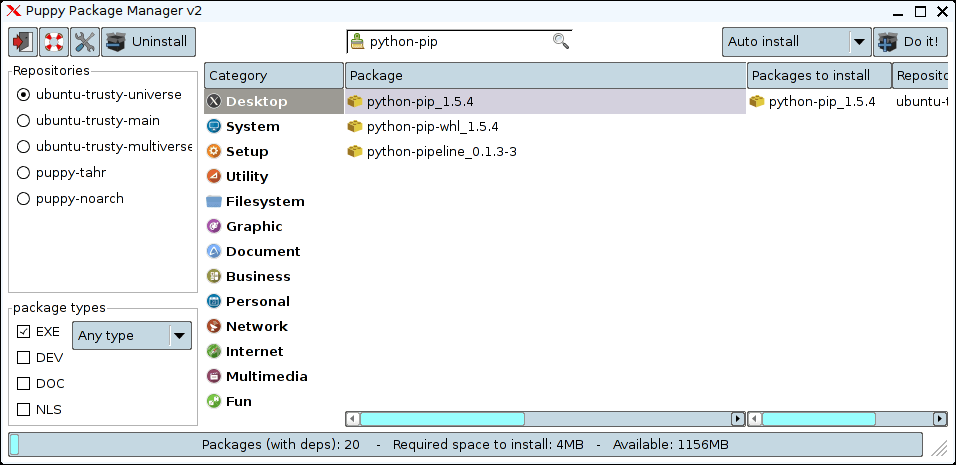 Open Puppy package manager by clicking Menu > Setup > Puppy Package Manager. Then enter python-pip in the search box. Select python-pip_1.5.4 and click Do it! button on the upper-right corner.