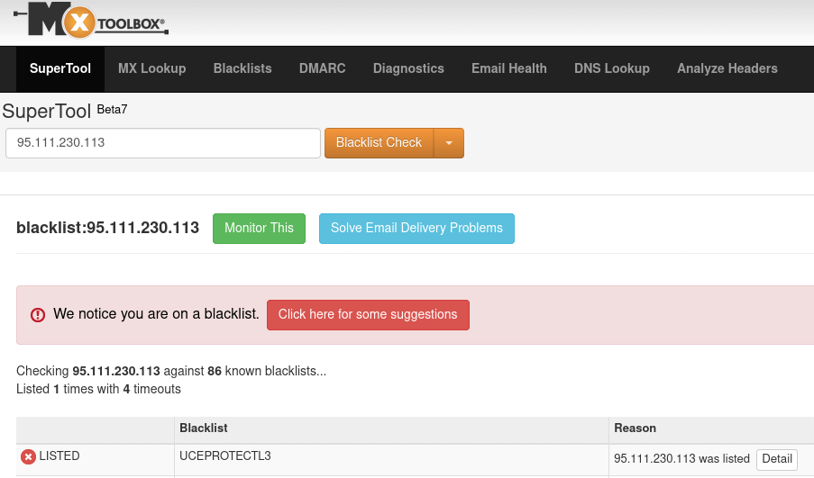 As you can see from the screenshot below, The IP address (130.51.180.110) of my mail server (mail.linuxbabe.com) isn’t on any blacklist.