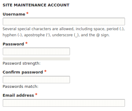 The site maintenance account is user 1 in a Drupal site. It’s like the root user on Linux who can do anything in the system including harmful things to the system. It is not best practice to use this site maintenance account to do normal stuff in a Drupal site. Choose a username other than admin or webmaster. These two username can be easily guessed. The email address is used when you forget the password of user 1. So enter an email address different from the site email address.