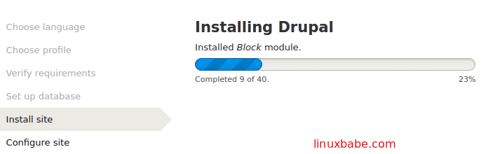 Click Save and continue button, it will begin installing 40 core modules which comes with the standard installation profile. If you choose minimal profile, then a lot of core modules will not be installed.