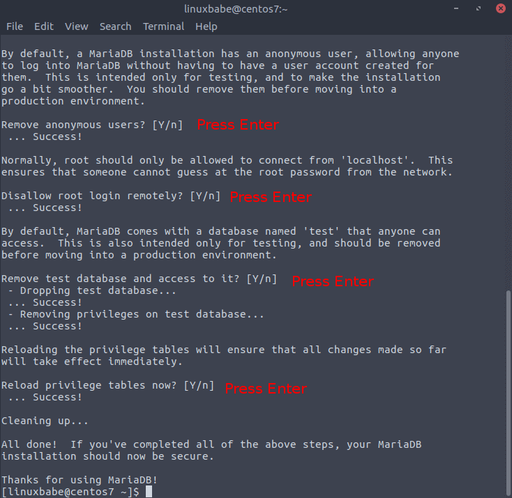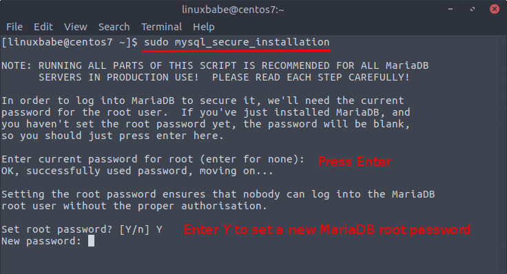 After you set the root password, you can simply press enter to answer all of other questions. (Note that the letter Y is capitalized, which means it’s the default answer.)