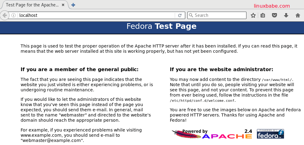 Now in your browser’s address bar, type the IP address of Fedora. You should see the Fedora test Web page which means Apache Web server is running correctly.