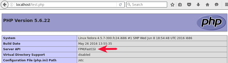 Now if you check the test.php file in your browser, you will find that Server API is FPM/FastCGI which means Apache web server will pass PHP requests to PHP-FPM.