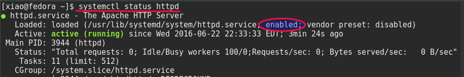 ● httpd.service - The Apache HTTP Server Loaded: loaded (/usr/lib/systemd/system/httpd.service; enabled; vendor preset: disabled) Active: active (running) since Wed 2016-06-22 22:33:33 EDT; 3min 24s ago Main PID: 3944 (httpd) Status: "Total requests: 0; Idle/Busy workers 100/0;Requests/sec: 0; Bytes served/sec: 0 B/sec" Tasks: 11 (limit: 512)