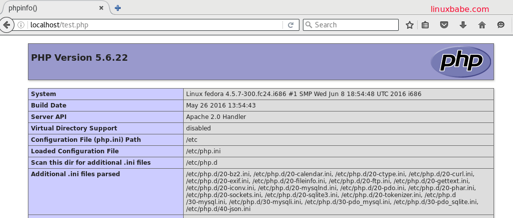 Server version: Apache/2.4.18 (Fedora) Server built: Feb 4 2016 03:01:27