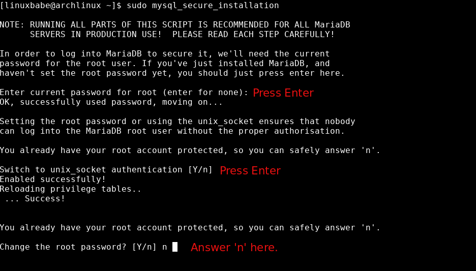 When asked if you wan to switch to unix_socket authentication, you can press Enter. (Note that Y is capitalized, which means it is the default answer.)  When asked if you want to change root password, answer ‘n’, because unix_socket authentication doesn’t require the MariaDB root user to have a password. Then you can press Enter to answer all remaining questions, which will remove test database, anonymous user and disable root remote login.