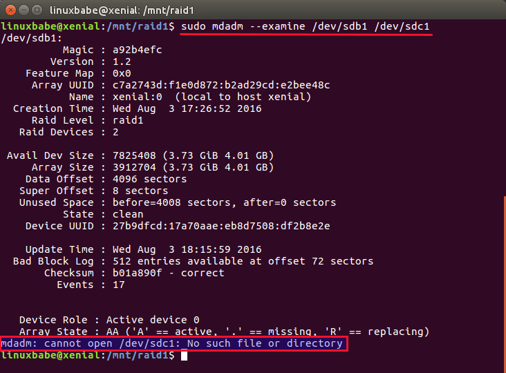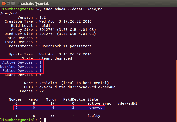 Save and close the file. Next, remove one of your drives from your computer and check the status RAID 1 device again.