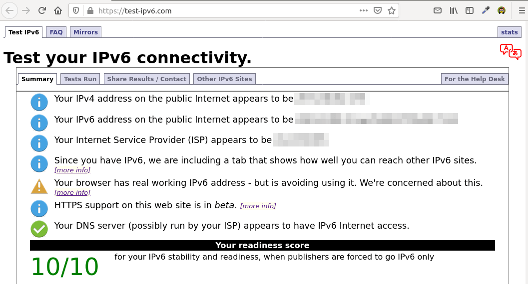 Restart your VPN client and go to https://test-ipv6.com/ to check your IPv6 connectivity. If everything goes well, you should see your VPN server’s IPv4 and IPv6 addresses in the test result. And the warning “VPN is only protecting one protocol” should be gone.