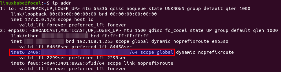 Locate the main network interface. If you can find a inet6 .... scope global line like below, then you have a public IPv6 address. The inet6 address with scope link is a private IPv6 address.