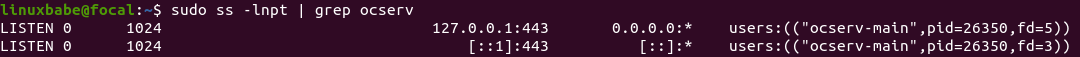 Now run the following command to check the listening status of ocserv. You will see that it’s listening on both 127.0.0.1 and ::1.