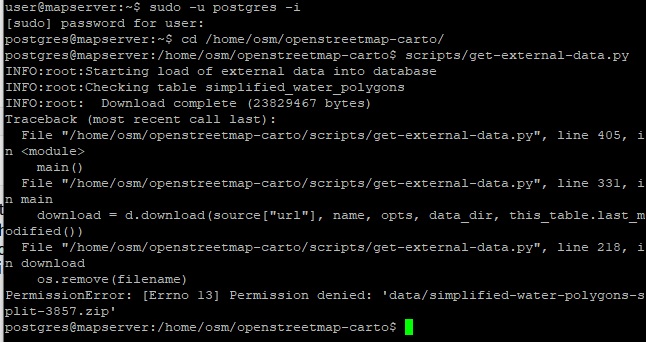 Download the latest CartoCSS map stylesheets to the osm user’s home directory with git.