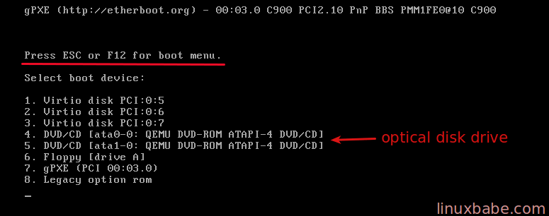 Normally you have to press a key like ESC or F12 in the VNC window to bring up the boot menu, which allows you to select which device your VPS will boot from. Select optical disk drive so your VPS will boot the Ubuntu ISO image. Note: The default firmware for KVM virtual machines is called SeaBIOS.