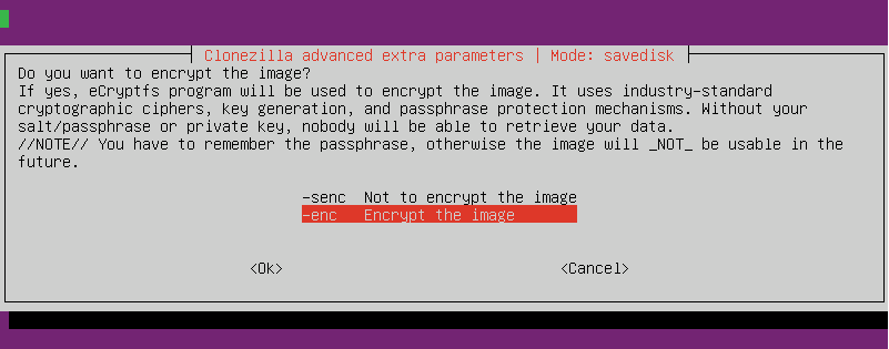 In the next screen, you have the option to encrypt the image, which is useful if you save the image on a network location, so I choose to encrypt the image.
