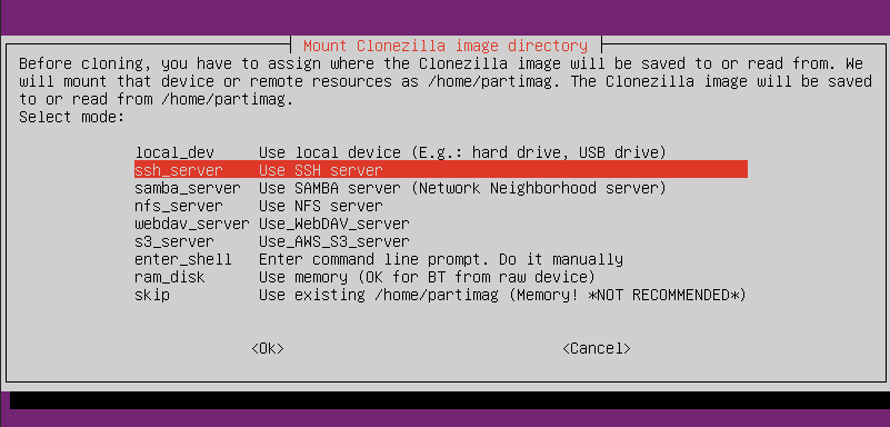 Then select where the image will be read from. I stored the image on a remote SSH server, so this time I also make Clonezilla read the image from the remote SSH server.