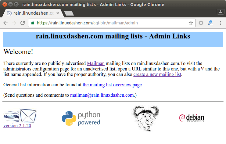Now you can access Mailman admin page via the following URL and create new mailing lists.